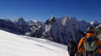 All going to plan and the weather on our side, we will move up to a rock and glaciated camp just off the Mera La saddle at approx 5400m. Plastic mountaineering boots are usually worn from base through to the summit bid and return. Whilst they feel clumsy they are perfect for the job, providing warmth, protection and stability for the variable terrain including loose rocks, snow and ice. Another camp is set half way up the long north slope of the mountain, at about 5700m near a rock knob. Although it is a shorter distance here, it can be difficult in poor conditions and you are at altitude and is harder and further than it first appears. The summit bid will commence early in the morning (anywhere from 2 to 5am) from this high camp, and take around 4 to 6 hours to make the summit. Whilst the distance doesn't look far, we can assure you it will be hard work, and all the preparations and a positive, tempered attitude will pay off here. It is usually necessary to rope up for much of the summit approach due to crevasse hazards along the route. The route can vary depending on the conditions of the season but usually skirts around a major shoulder in front of us to the back side of the mountain and then traverse in a fairly straightforward approach to the summit knob. As the light comes, we enjoy incredible views across to Baruntse (7129m), Chamlang (7319m) and Nau Lekh (6360m) with Makalu (8481m) looming behind. Further to our left is Everest, Cho Oyu and in the distance on a clear day, Kangchenjunga. Please note that due to the unstable nature of the northern summit knob, we will generally ascend the central summit (6461m) of Mera. The exact schedule will depend on many factors, including the weather, condition of the route and condition of the members. Our contingency of equipment and experienced staff and a time buffer, gives us a fair amount of flexibility to achieve success for all who have worked hard from the beginning of the expedition. The day will be long, and this is where all the training beforehand, the trek approach, and the right attitude will combine to give you stamina and confidence to be part of a sound team, with optimum chances for the summit.