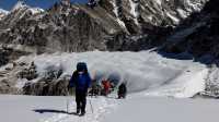 A steady approx 4hr climb out of the valley and up through lateral moraine and grassy culverts to our last camp below the snowline. Enroute we will be able to glimpse the remains of the Lake (Sabai Tsho) that has caused so much damage. It is directly fed by some massive, almost vertical glaciers and it is suspected that there was an enormous avalanche of ice into the lake, and subsequently, a wave that broke through the loose rocks forming the wall on it's far side. A day is set aside for further preparations for the climb, rehearsal of using harness, crampons and axe, and travelling roped up etc. All members will not travel up on to the mountain and glacier without being briefed and skilled beforehand. Whilst the route itself is fairly straightforward, there are objective hazards and good basic technique and awareness of changing conditions is vital for every individual. Your guide will supervise the entire proceedings on the mountain, from the route taken and timings, and equipment required (we only take what we need for the climb, and the rest of your gear remains at base) through to people's fitness (mental and physical) to proceed. This means that the guides decision is final; he or she is responsible for everyone's safety and well being throughout the expedition, and no compromise will be made on these aspects.